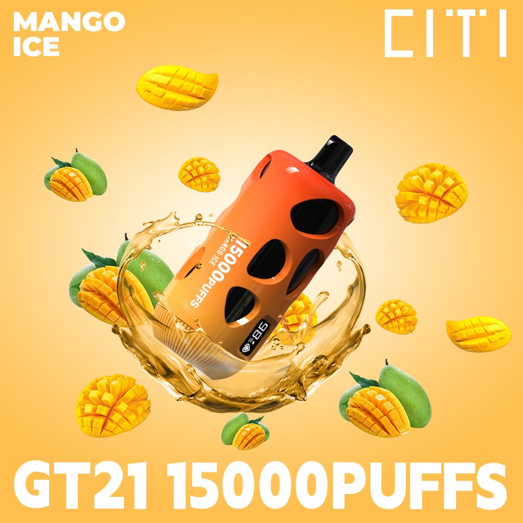 سيجارة إلكترونية فاخرة سيتي ديسبوزابل، ١٥٠٠٠ نفخة GT21 - مانجو آيس - (قابلة للشحن) ٢٠ ملغ - منتج تبخير عالي الجودة متوفر لدى بيتافيب. توصيل سريع لجميع أنحاء مصر.