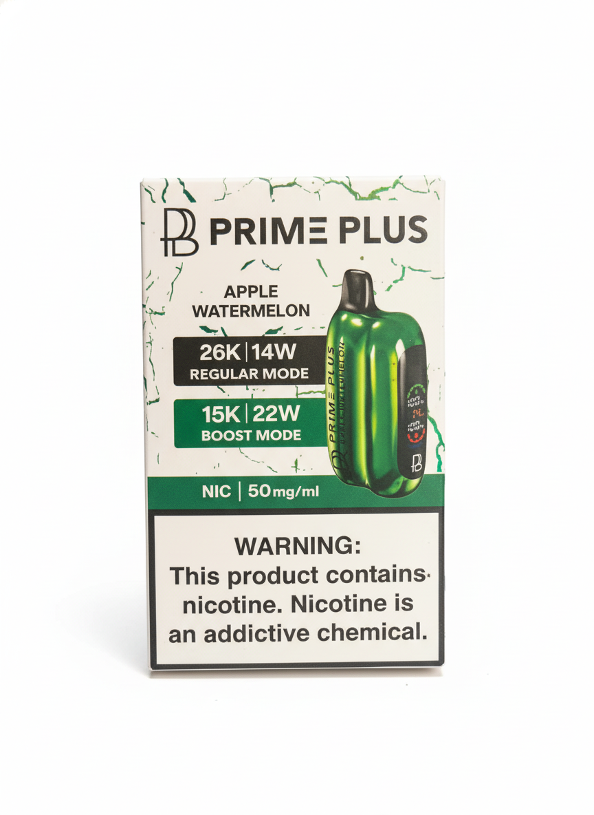 Prime Plus 26000 Disposable is Prime Bar’s latest release. It showcases a unique rectangle shape with rounded edges, a comfortable mouthpiece, and a glossy design. The side-located screen provides data on puffs, voltage, battery, and eLiquid statuses. Furthermore, the Prime Plus Bar utilizes an integrated 850mAh rechargeable battery that supports 14W for regular mode and 22W for boost mode.